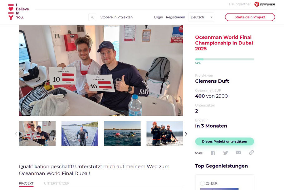 Freiwasserschwimmen, vor allem auf internationalem Niveau, ist ein relativ teurer Sport. Trotzdem habe ich in den letzten Jahren all meine Schwimmabenteuer selbst finanziert – aber auch meine Mittel sind irgendwann erschöpft. Deshalb bitte ich dich/euch, mir zu helfen – damit ich in Dubai starten und Österreich mit Stolz vertreten kann.